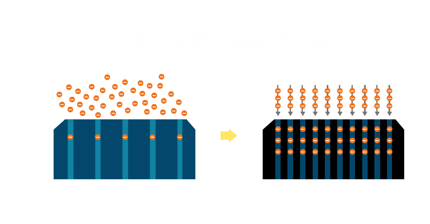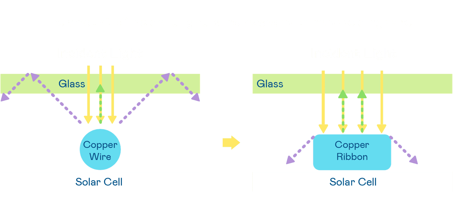 • 电池使用多条铜导线 (Copper wire) 于电池片上形成较短的电流路径,,,,提高电流收集效率,,,采用圆形设计的铜导线较传统扁平式的铜焊带 (Ribbon),,,,可增加入射至电池的光线量。。。。