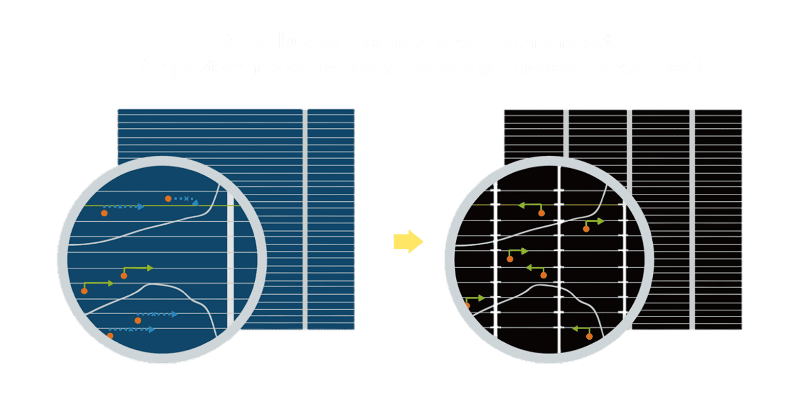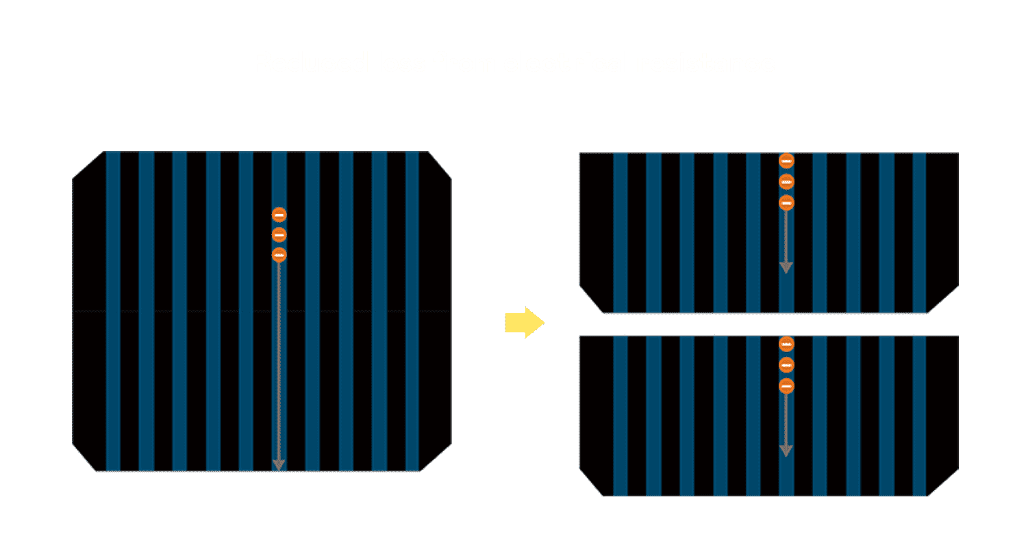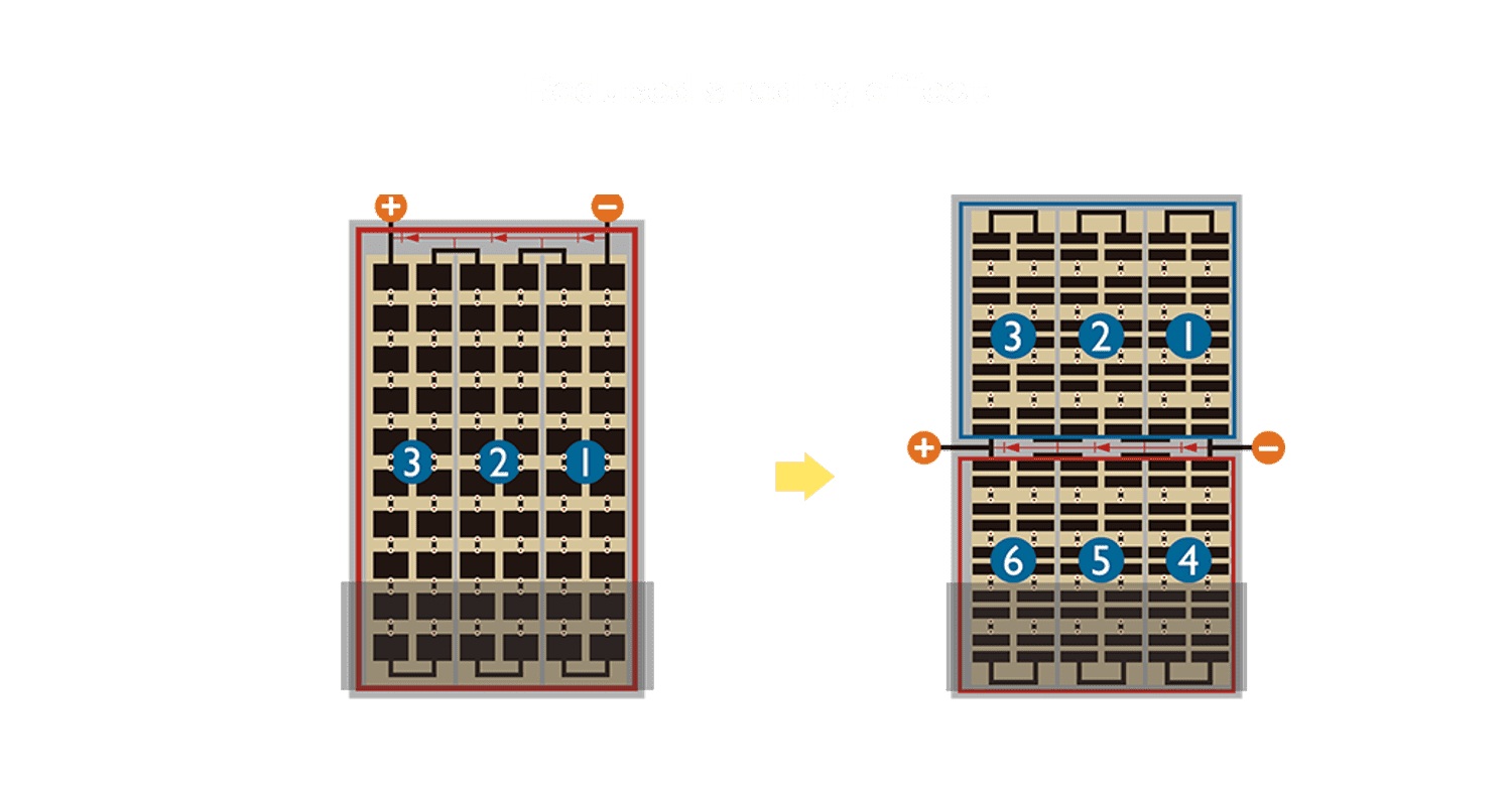 • 结合半切电池,,,,降低遮阴影响、、、提升模组抗隐裂能力、、、、并减少电阻损耗,,,进一步提升模组发电效能。。